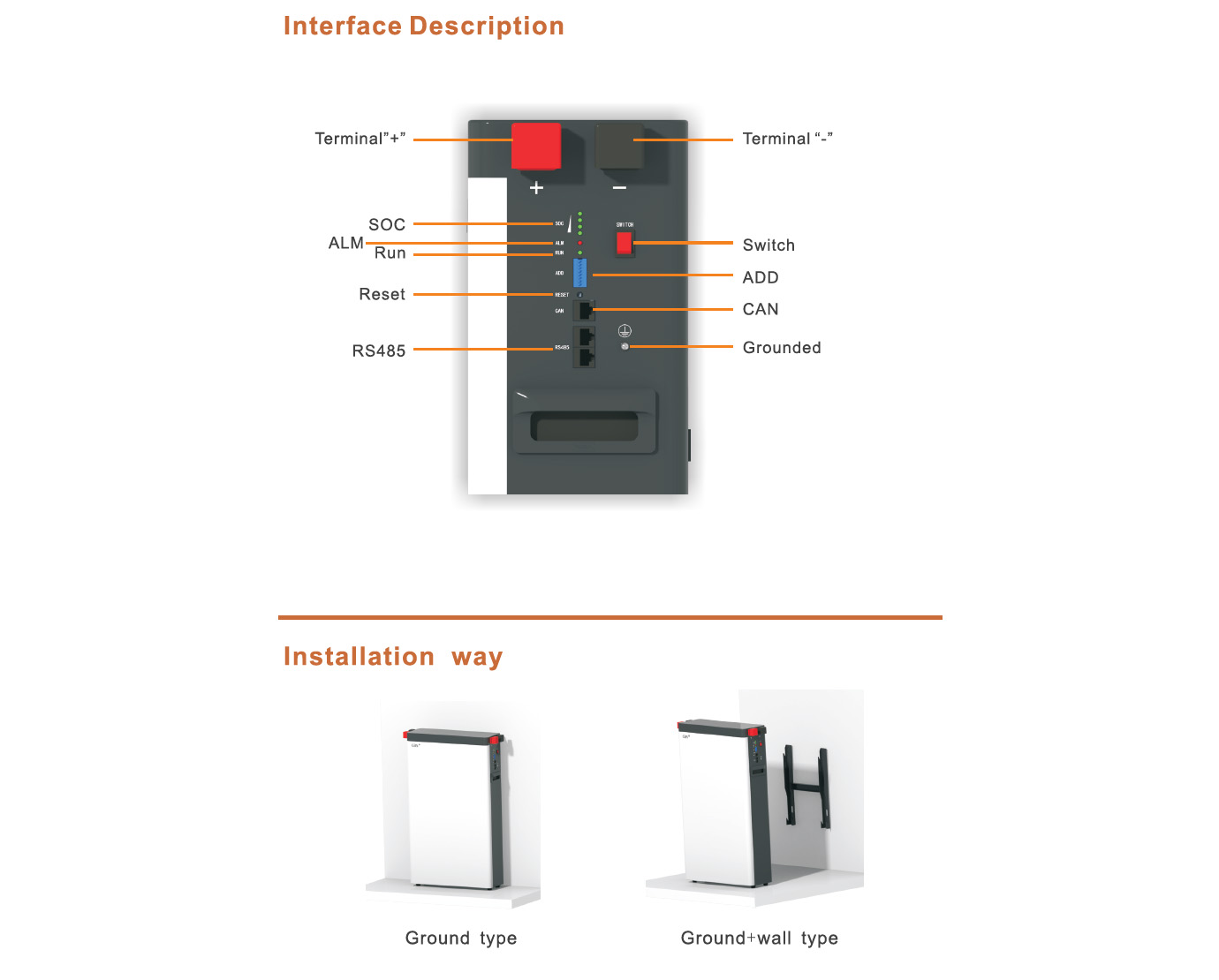 | Installation | Ground mounted or ground+wall mounted |
